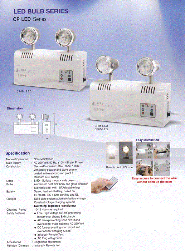 ไฟฉุกเฉิน : ชนิดมีแบตเตอรี่บรรจุภายในเครื่อง พร้อมระบบควบคุมแบบ Automatic