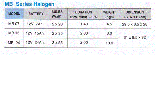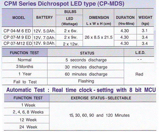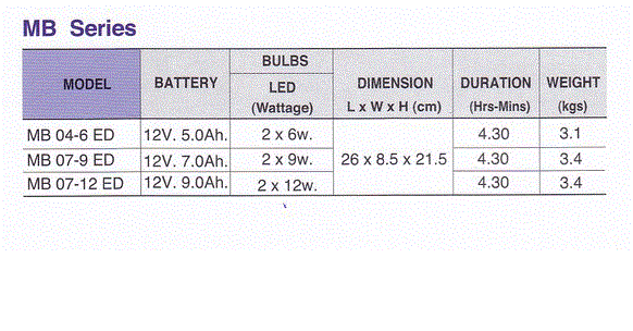 สามารถจ่ายกระแสไฟฟ้าให้กับหลอดไฟฉุกเฉินตามตารางด้านล่างนี้ และมี